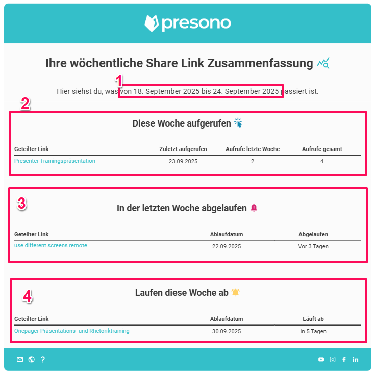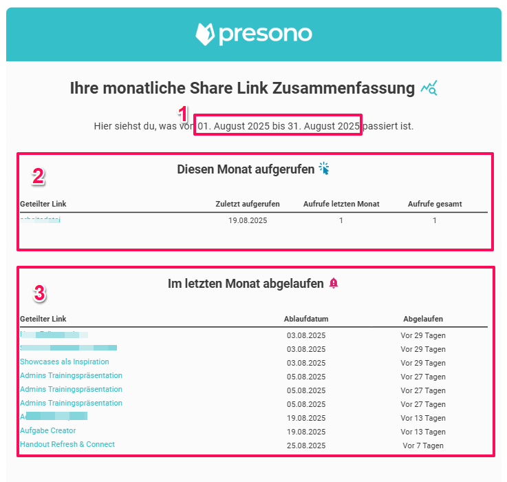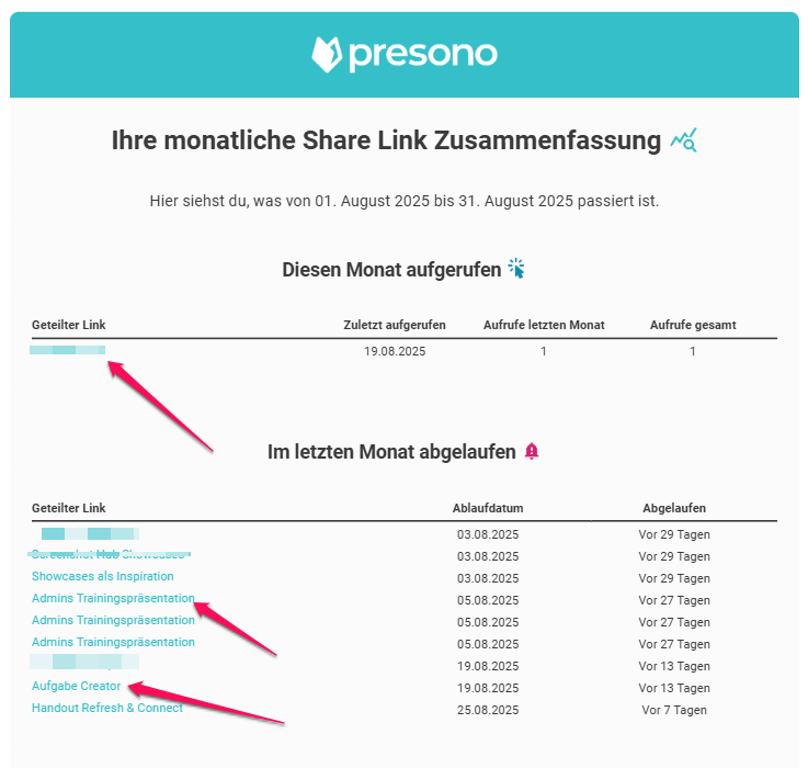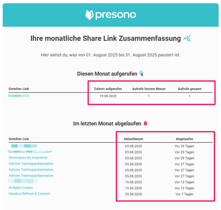 Um den Überblick über deine geteilten Links zu behalten, kannst du dir nun eine wöchentliche oder monatliche Zusammenfassung per Mail direkt von presono zuschicken lassen. In diesem Artikel zeigen wir dir wie's funktioniert!