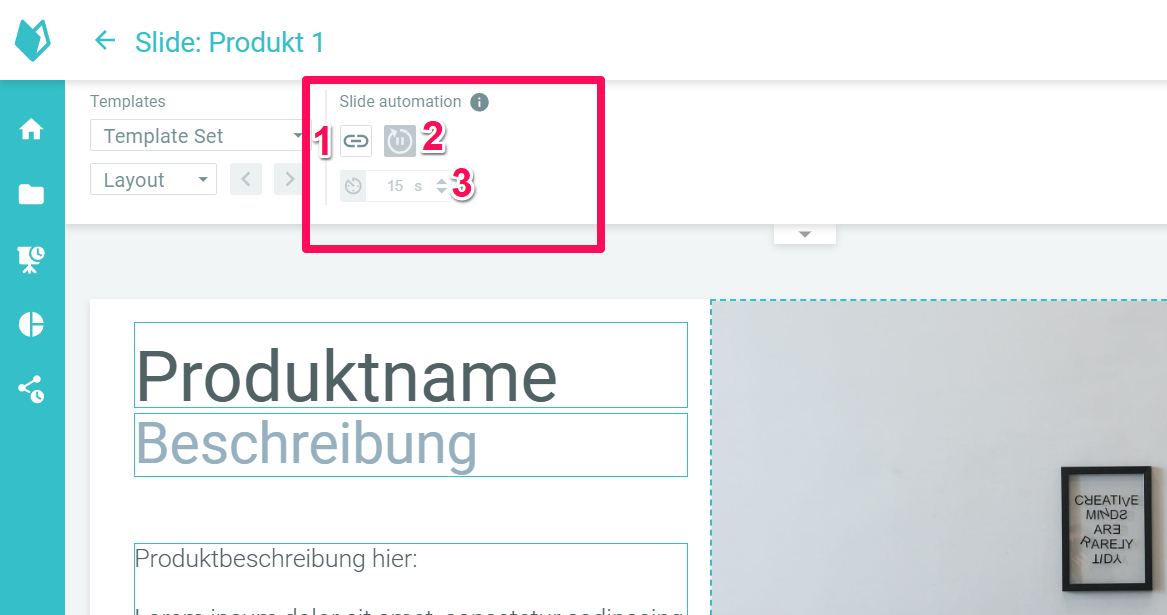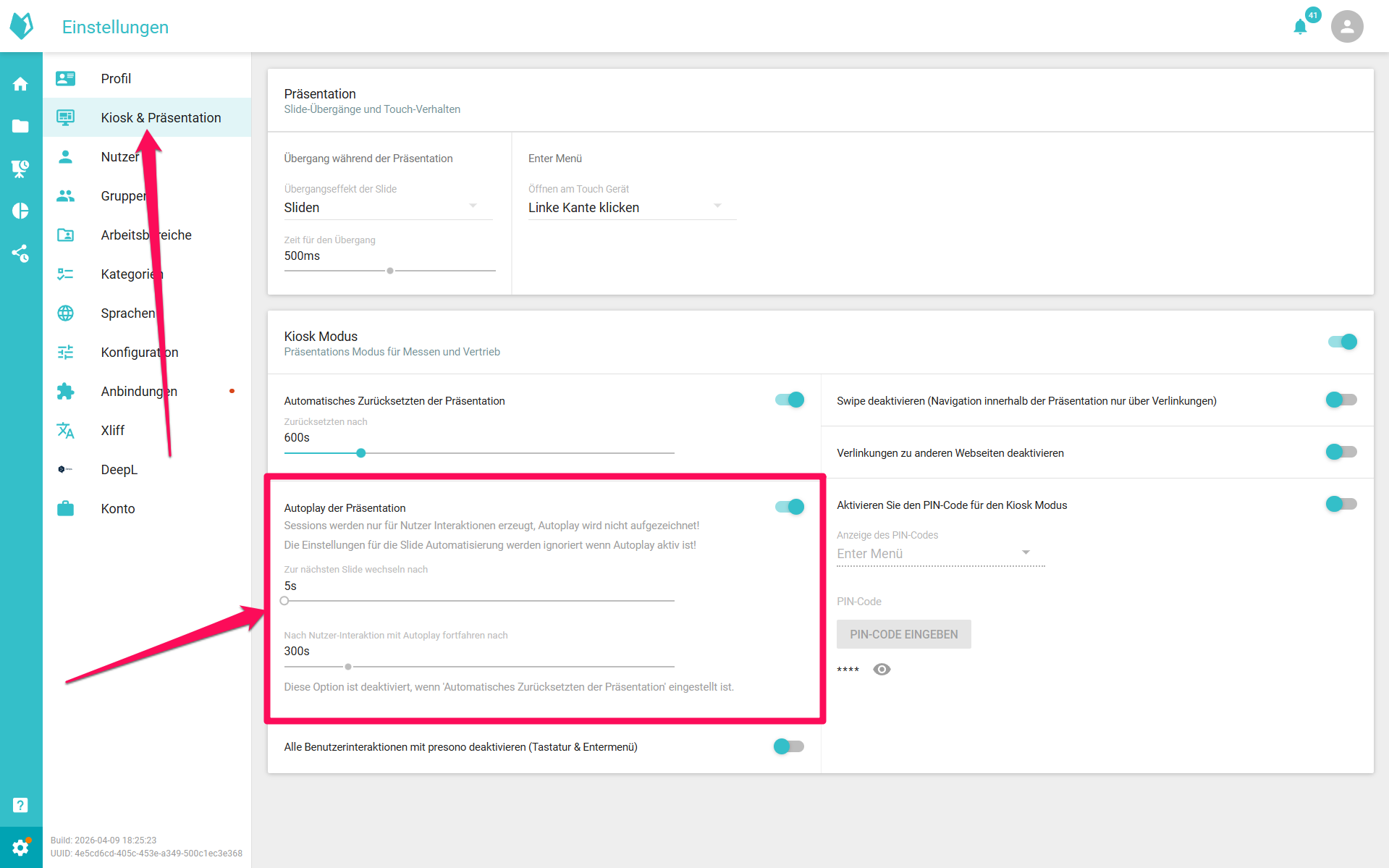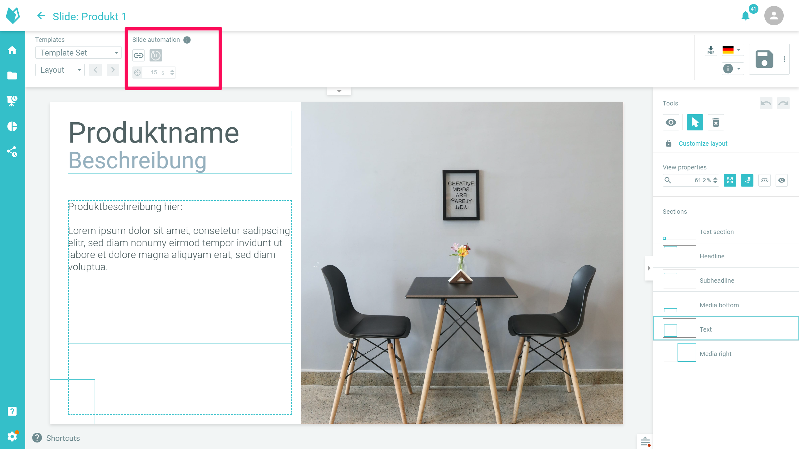 Für Slides in presono kann jetzt bei der Slide selbst ein spezieller Link gesetzt werden, der nach einer eingestellten Zeit automatisch ausgelöst wird. Wenn du beispielsweise eine Intro-Slide hast, kannst du dort einstellen, dass nach z.B. 20 Sekunden auf eine weitere Slide gewechselt wird, ohne dass du etwas klickst.
