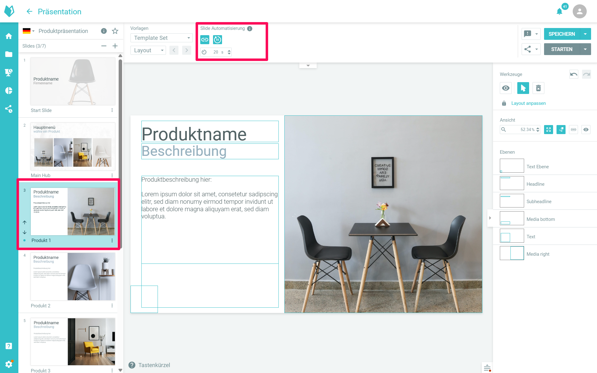 Also immer wenn die Slide präsentiert wird, wird die Automatisierung gestartet. Also wenn die Slide in einer Präsentation enthalten ist (in der Playlist links selbst), aber auch wenn sie über Links eingefügt wird oder übers Entermenü. In jedem Fall wird die Automatisierung gestartet und kann nur gestoppt werden, wenn ich mit der Slide interagiere.