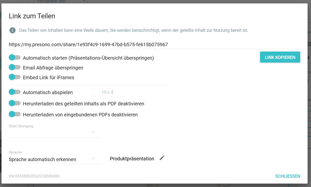 Hier hast du die Möglichkeit deine Präsentation entweder als PDF oder als interaktiven Link zu teilen. Ein PDF ist eine relativ statische Möglichkeit deine Präsentation zu teilen, jede Slide ist eine eigene Seite im Dokument. Animationen, klickbare Elemente, Videos und 3D Objekte können darin nicht mehr interaktiv genutzt werden. Möchtest du all diese Elemente in vollem Umfang versenden, dann klicke auf "Präsentation teilen". Es öffnet sich ein Link, den du in die Zwischenablage kopieren und dann über beliebige Kanäle (Mail, Chat, o.ä.) verschicken kannst. Dieser Link kann in jedem gängigen Browser geöffnet werden. Dazu wird kein Account bei presono benötigt. Erlebe damit die Präsentation mit allen Links, Animationen, Medien und Dokumenten! Mehr zum Präsentation teilen findest du hier: Präsentation teilen oder hier: Präsentationen/Sessions als Link teilen