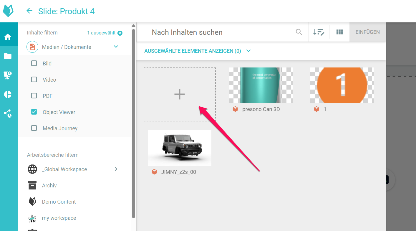 Die Bilddaten kommen dabei zum Beispiel aus einem Rendering/3D Programm oder es sind wirklich reale Fotos. Um es in presono als 3D Objekt zu speichern, klicke zuerst auf "Element hochladen" entweder in der Content Struktur oder direkt in deiner Slide auf das Plus beim Einfügen eines Bildes.