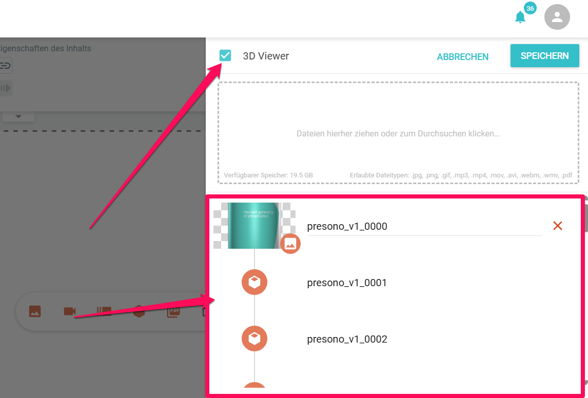 Bevor du auf "speichern" klickst, wähle oben die Option "3D Viewer" aus - damit wird deine Bilderreihe dann als ein Objekt bzw. 3D Modell hochgeladen/behandelt.