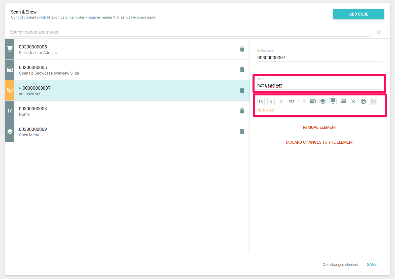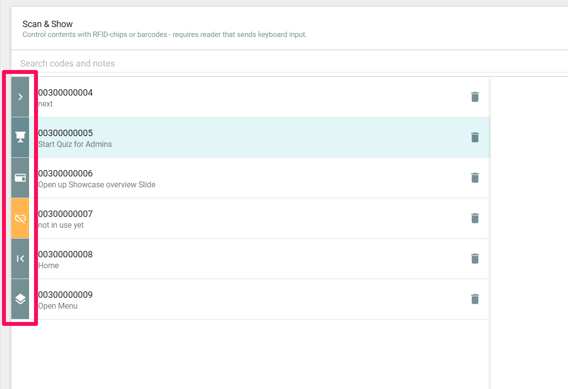 Once you have set a link, the icon on the left in the overview will change so that it is always clear what happens when the corresponding code is scanned.