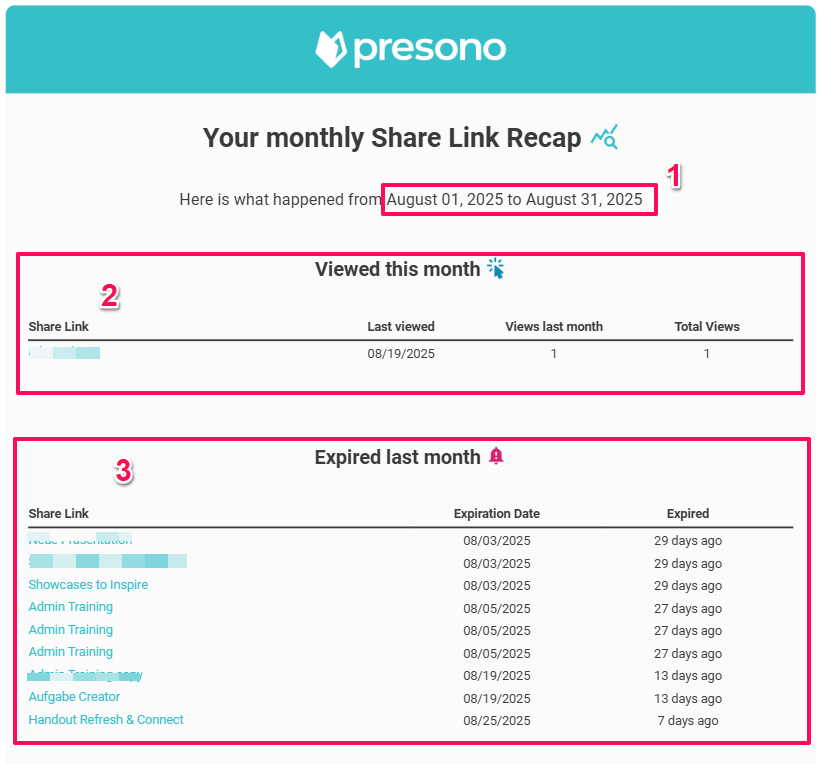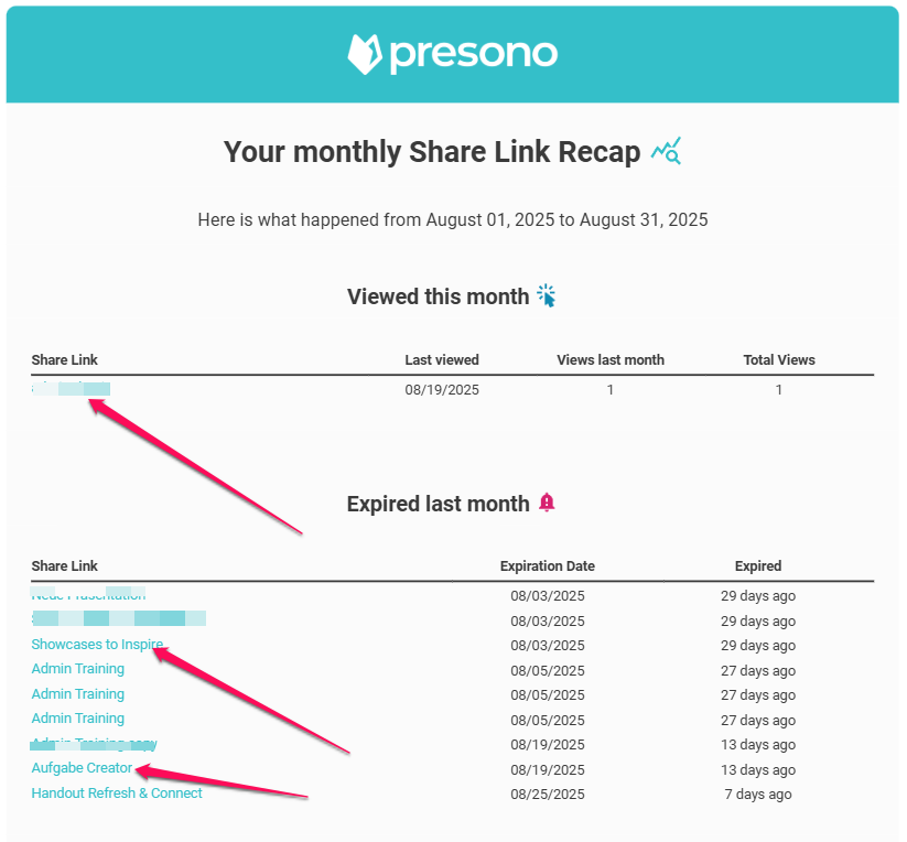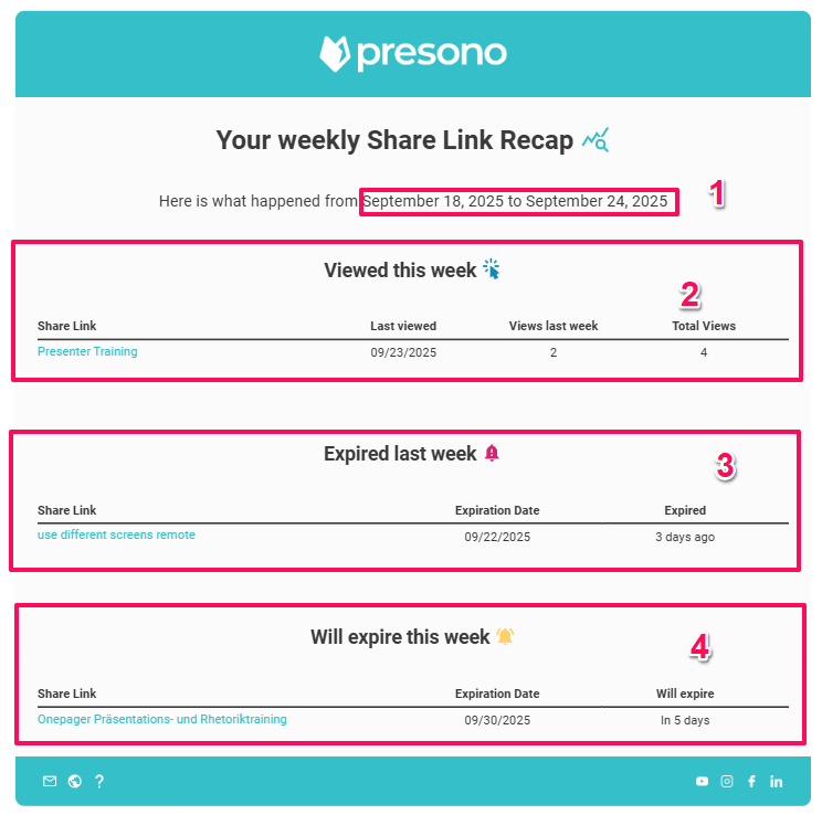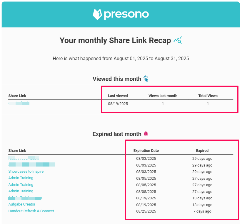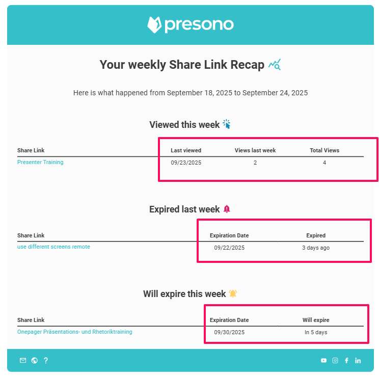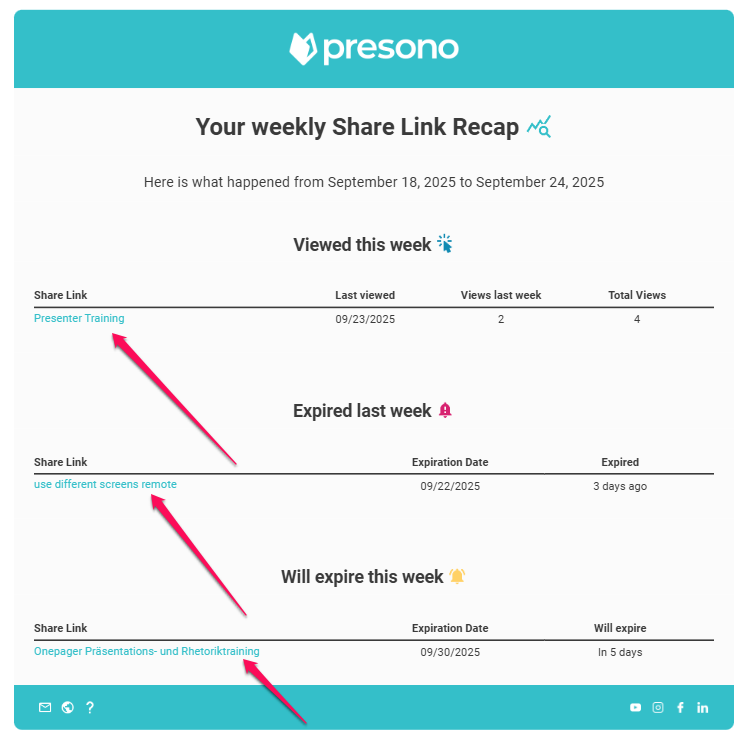 To keep track of your shared links, you can now have presono send you a weekly or monthly summary directly to your email. In this article, we'll show you how it works!