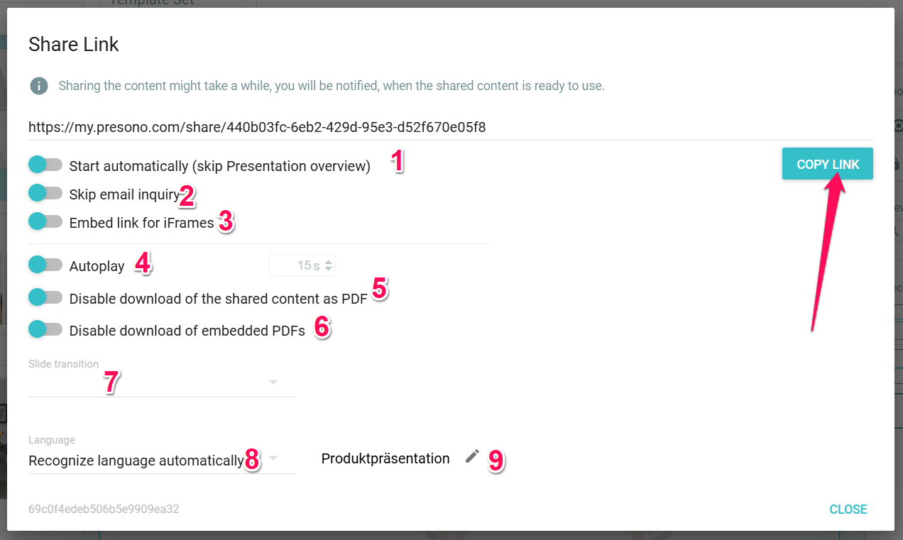 If you want to share your session or presentation as an interactive link, an individual share link will be generated for exactly this one session or presentation, which you can simply copy to the clipboard and then share via any channel (mail, chat, etc.).